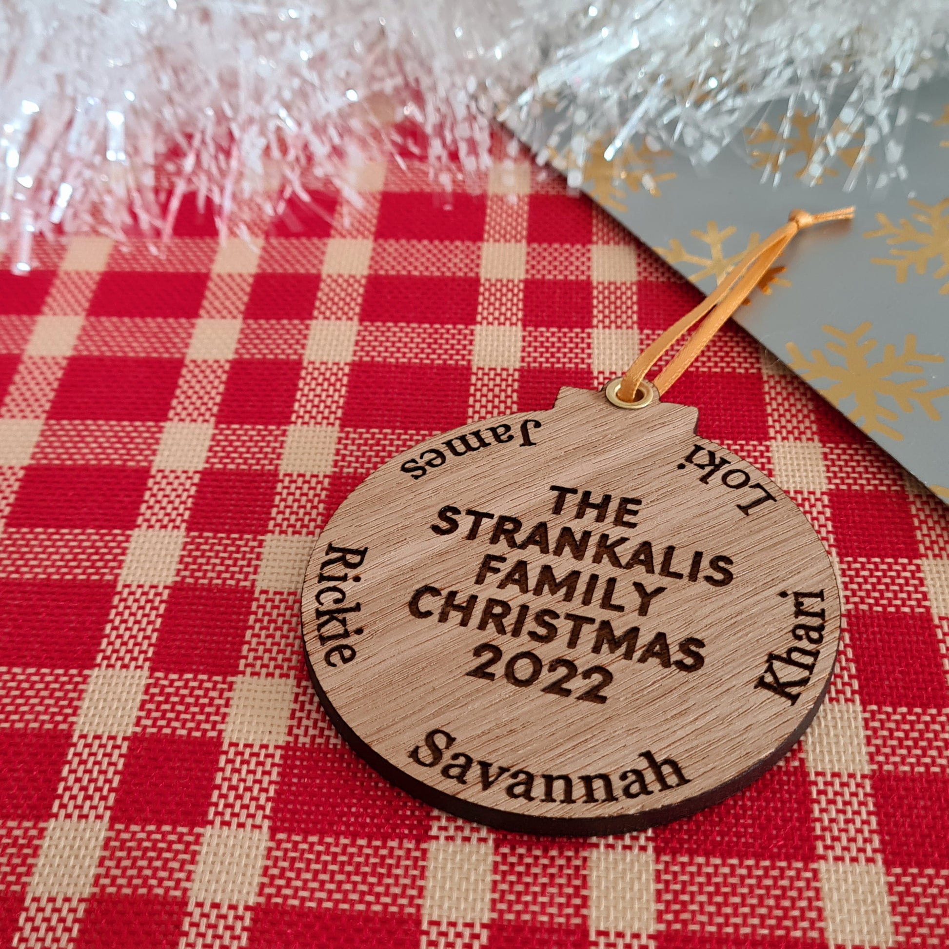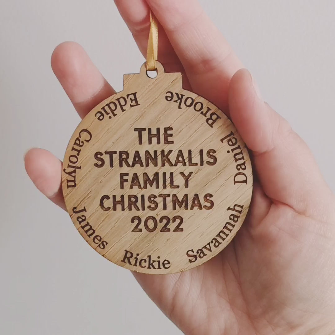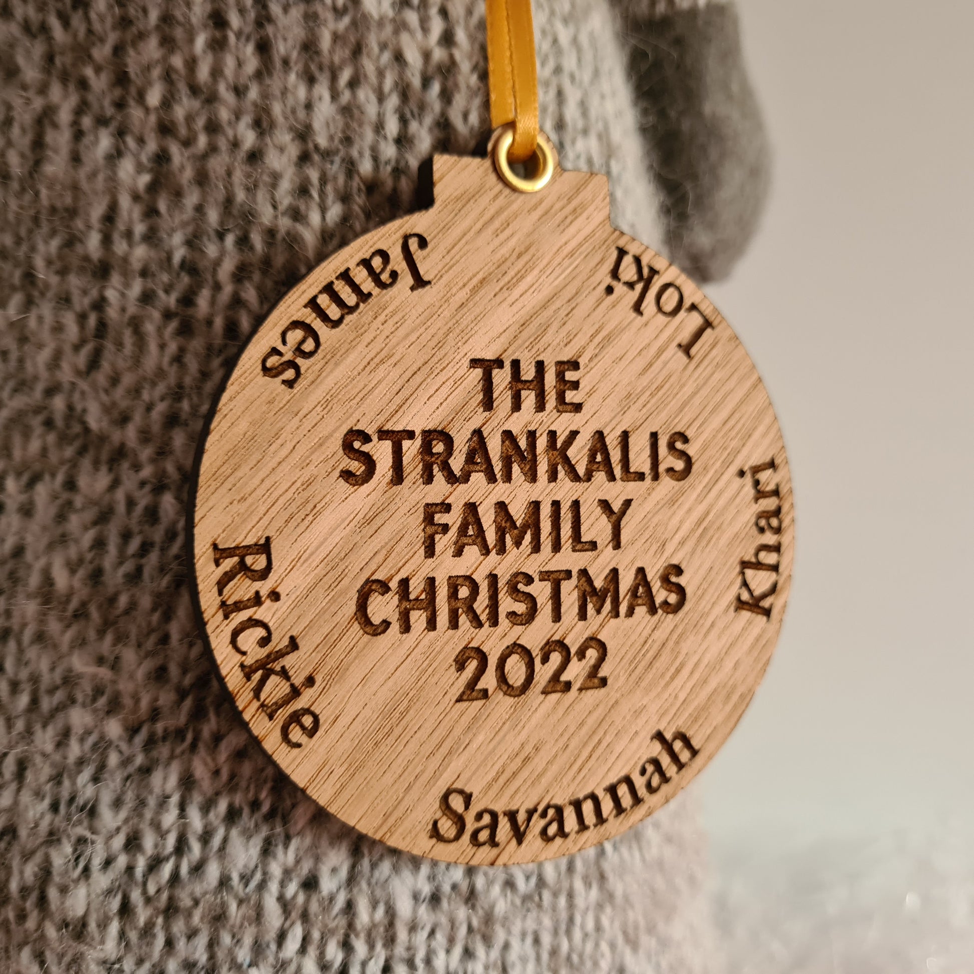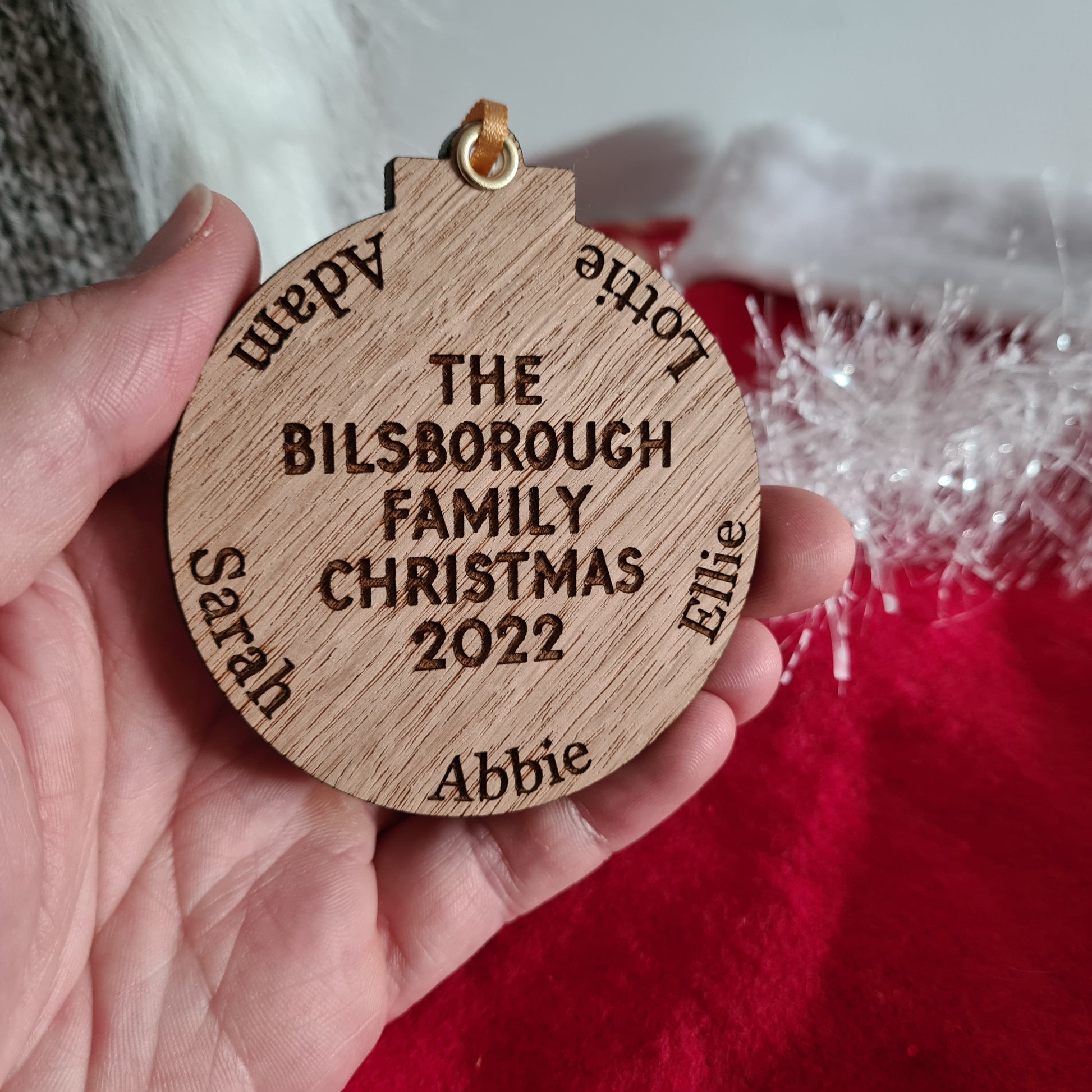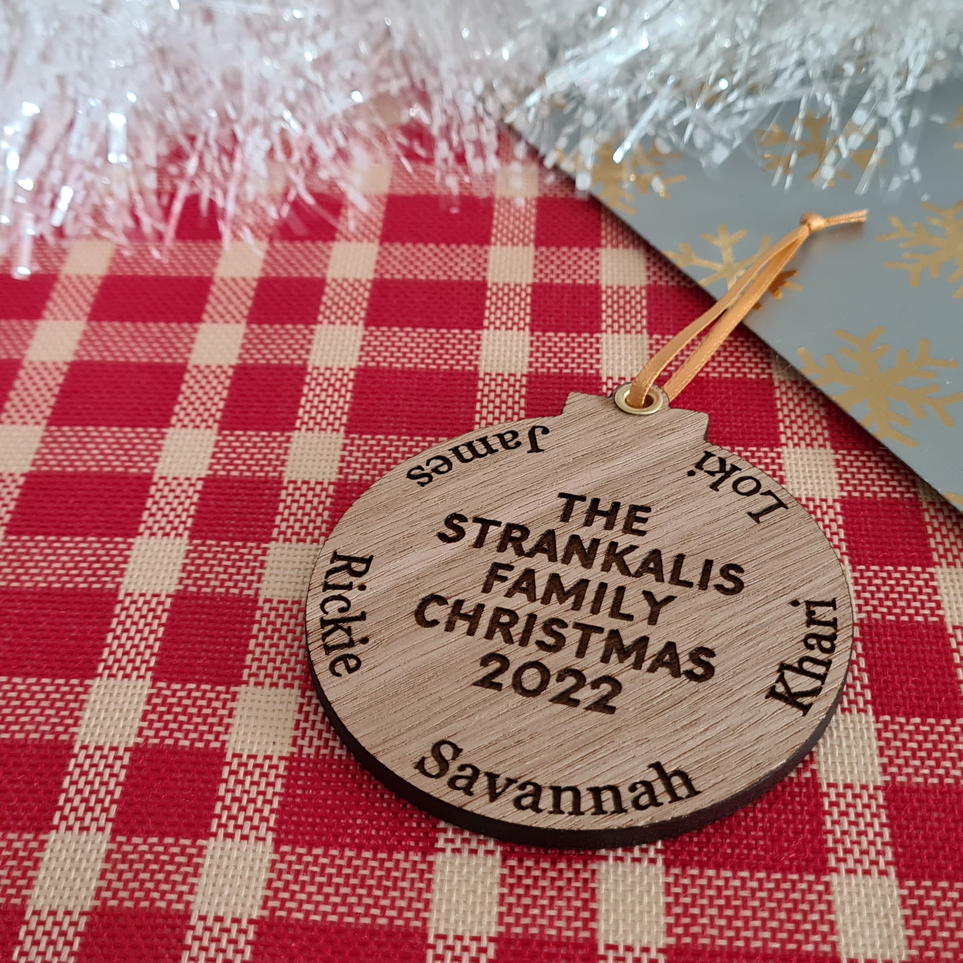 Gifts don't have to cost the Earth to mean the World. These Family baubles are a great example of that, and are sure to be cherished for years to come. Add your family name in the centre, and everyone's names around the edge. Engraved in a real Oak veneer, and finished with a lovely ribbon, they will look incredible on your tree for years to come.