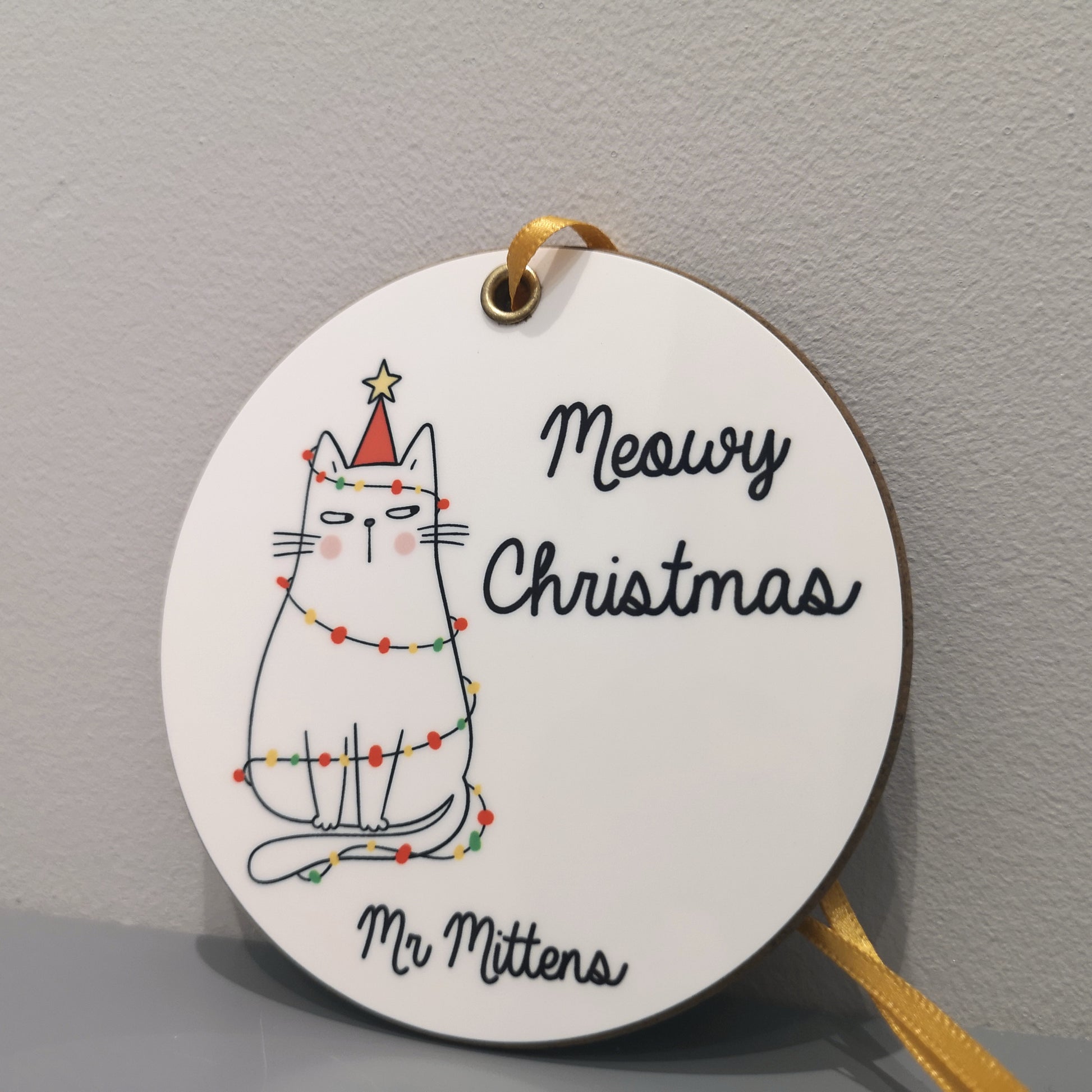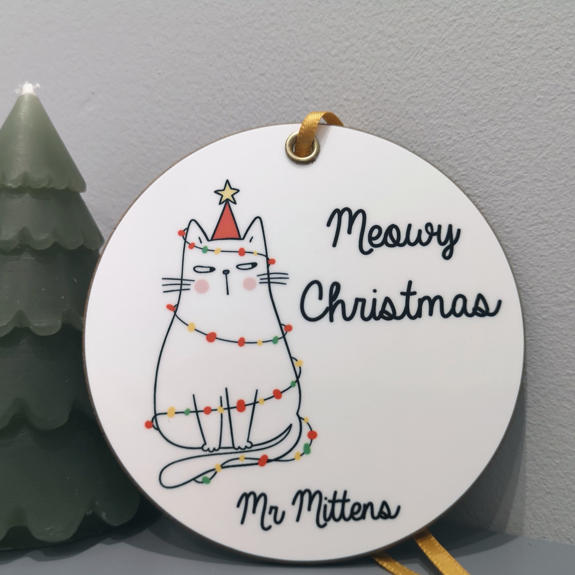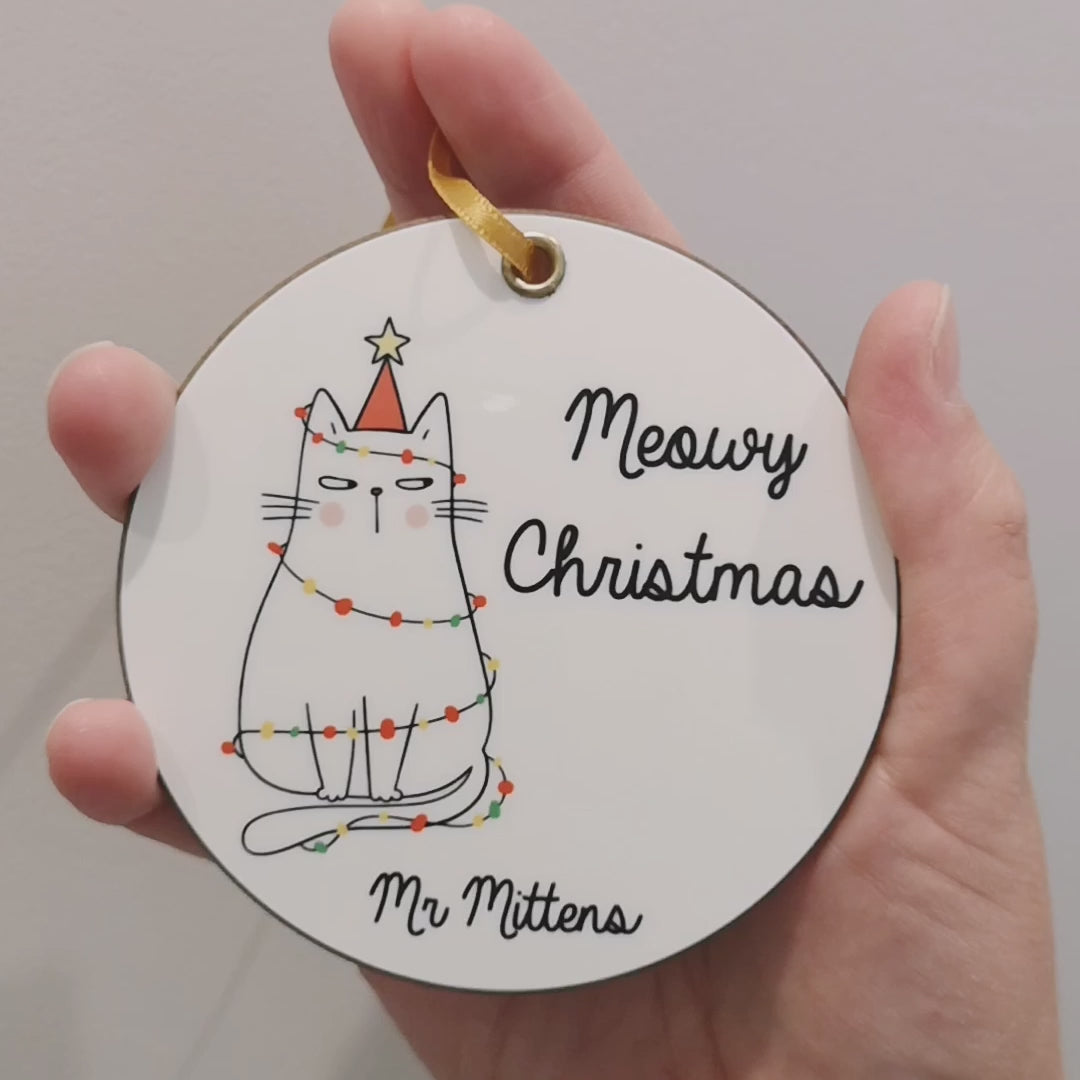 Please note: The text "Meowy Christmas" will always appear on the decoration. The personalisation required is for the name at the bottom. (E.g. Garfield)